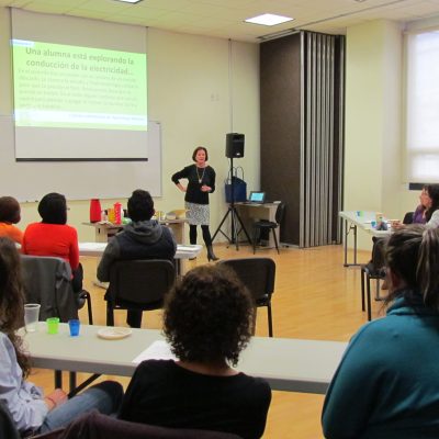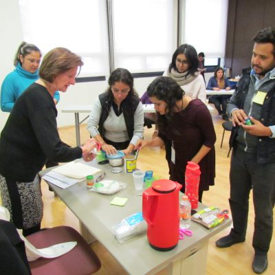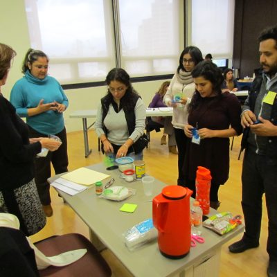 La segunda actividad consistió en elaborar pegamento casero. Los participantes se juntaron en equipos para producir pegamento con harina, sal, palillos y agua sin ayuda de la instructora. Esta inmersión en el papel del alumno en el aula les dio a los participantes la perspectiva del que aprende. A partir de las preguntas ¿qué esperabas que pasara?, ¿qué pasó?, ¿qué ideas tienes acerca de estos resultados? y ¿qué nuevas preguntas tienes?, se obtuvo la conclusión de que el alumno puede experimentar con diversos materiales para crear diferentes productos; se trata de iniciar con un aprendizaje vivencial y sin barreras en que el alumno averigüe cómo utilizar nuevos materiales; de este modo, se volverá adicto a conseguir más elementos para mejorar el trabajo, aprenderá de los malos resultados y buscará nuevas soluciones por su cuenta.